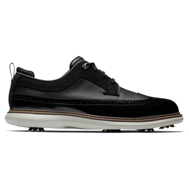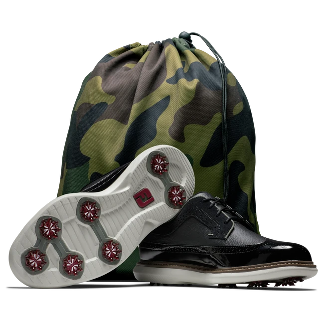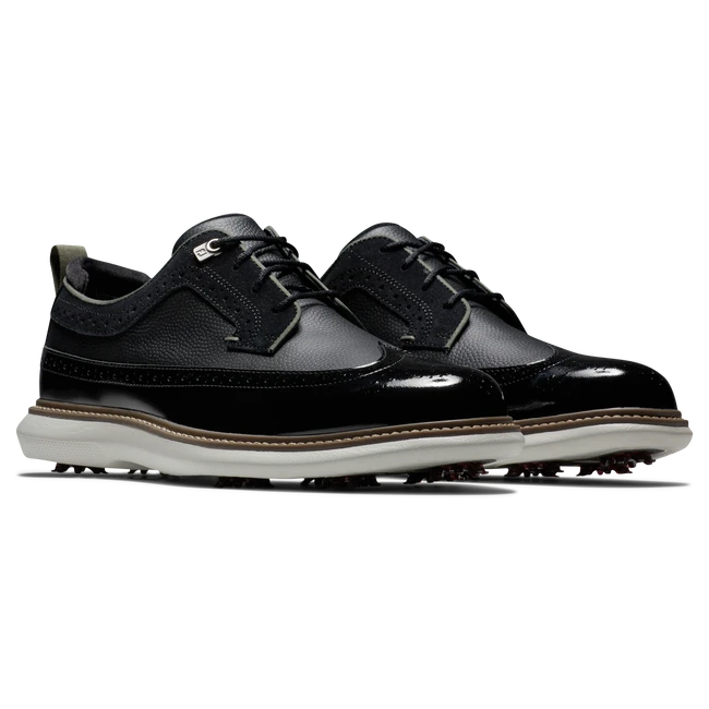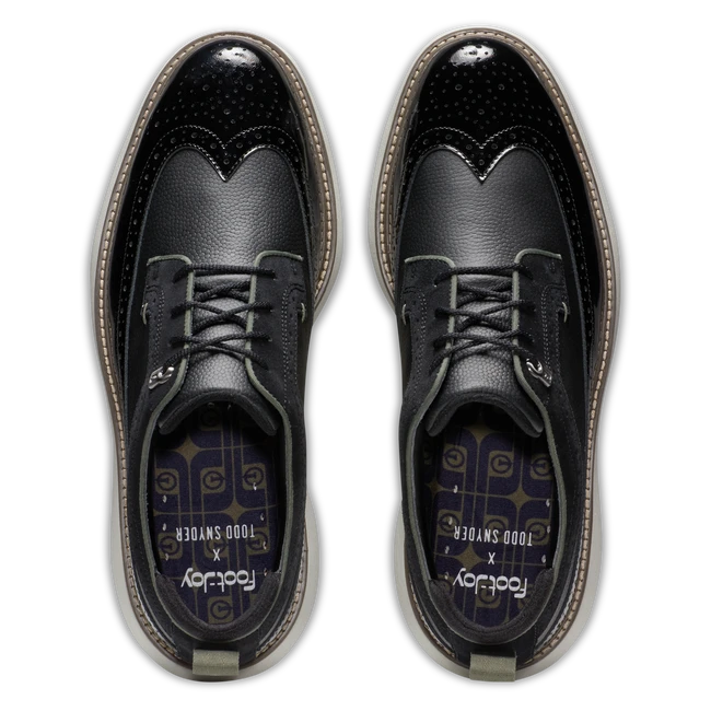 The number one golf shoe, in both performance and style — this is Todd Snyder’s sartorial take on FootJoy’s exceptional footwear. Luxe on the surface and state-of-the-art under the hood, they utilize advanced lightweight materials and proprietary technology. The body of the shoe is crafted from pebble grain leather and features a patent overlay. The Traditions Series delivers lightweight, super-cushioned comfort and game-changing traction — all with classic full-brogue detailing, from the decorative wingtip to the collar.